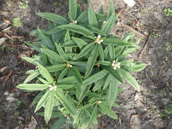 Blatt: dunkelgrün, glänzend, verkehrt lanzettlich, gräuliche Unterseite