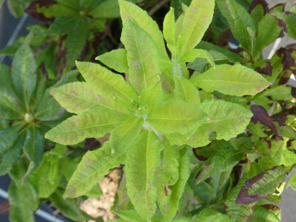 Blatt: schmal eiförmig, sehr klein, strohfarbene Unterseite,