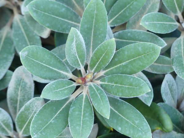 Blatt: immergrün,eiförmig-lanzettlich,Oberseite: dunkelgrün,Unterseite: dickes Indumentum (rotbraun)